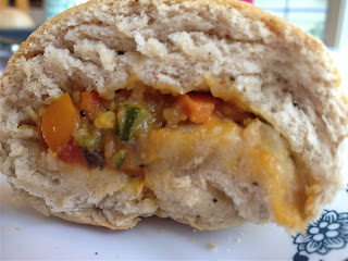 This was an inspiration from Rak's blog and we enjoyed this for dinner - two rolls each and we were quite full, although my son could easily handle a couple more (teenage boys being teenage boys) - I was initially making pizza dough and then had all these "non pizza" veggies that were staring me in the face in the fridge- made an on the spot decision to make these instead - I had seen them on Rak's blog when she first posted them and had forgotten about it.